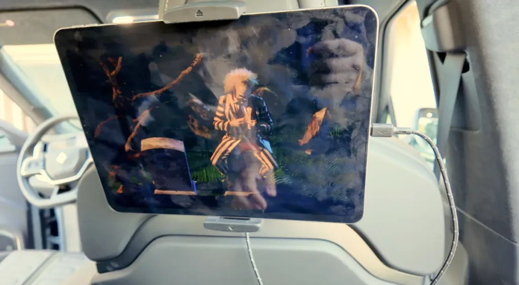 The mount features a swivel arm that allows you to position your phone or tablet in either portrait or landscape mode. I tested it out with my iPad Pro M2, and it fits perfectly, with full access to the USB-C charging port located conveniently at the back of the front seats. While the included USB-C cable is a bit long, a shorter cable would create an even cleaner look.