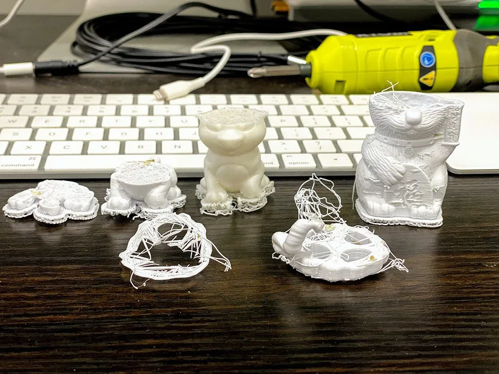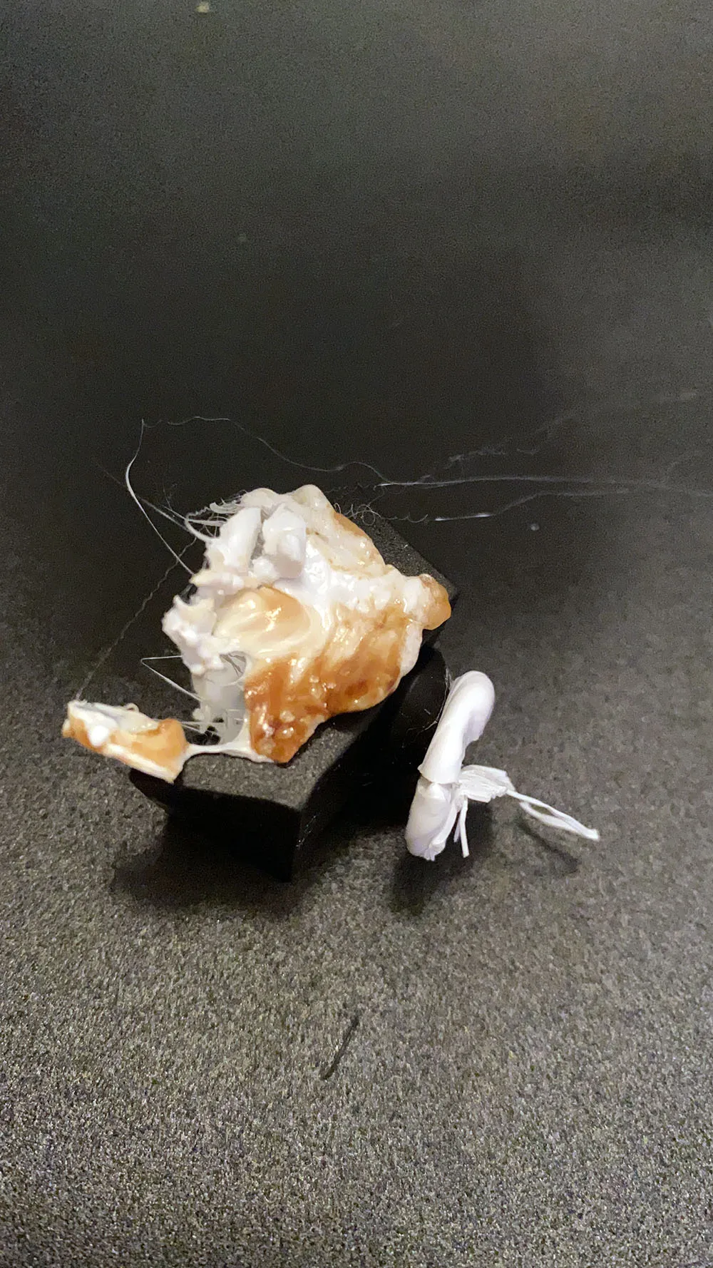I finally got a successful print. It took several tries and many hours of waiting. Long filaments but the cost isn’t that bad. It’s mainly the time and power consumption. Even with this print, there is a stain on the right leg – may have been due to excessive heat/burn during the print. I was pretty excited to finally get one print done so I printed another and it completed without any issues.