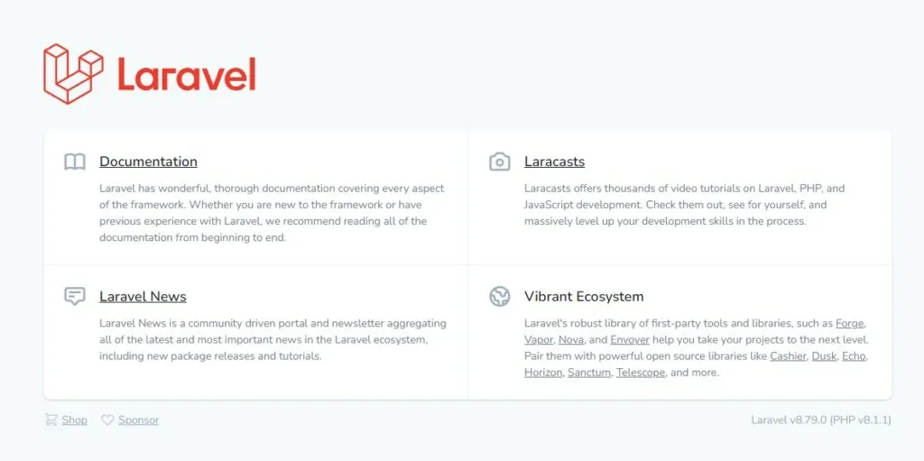 You are now inside your new Laravel application. From this point, you have multiple ways of running your application locally. My choice is to use Laravel Sail. Once up and running, you can open your browser to http://localhost or http://localhost:8000 – could vary depending on how you are running your environment.