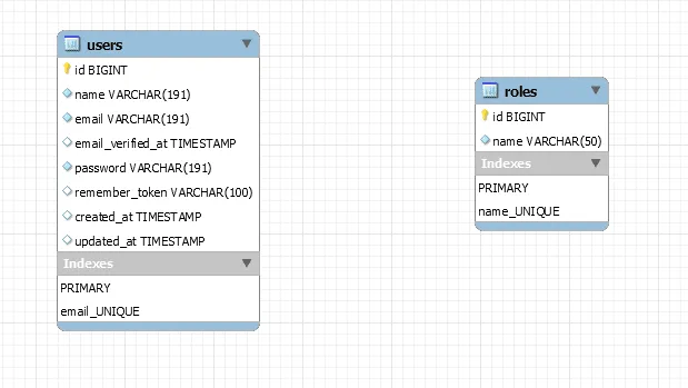 It is very similar as the previous design except you won’t have foreign keys in the users or roles table. There will be a pivot table that will have a foreign key for the users and roles table. You also won’t need to have the roles table created prior to the users table. But both users and roles table need to exist before the pivot table is created.