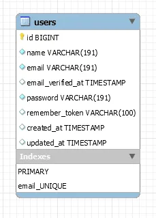 By default, Laravel comes with a migration file to create a users table. Running the migration file, you will get a table with the following structure.
