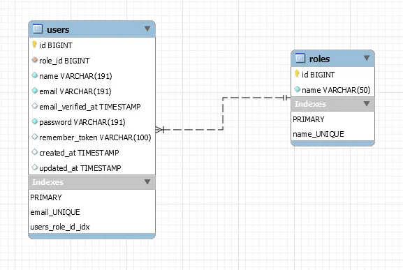 This will create a migration file. The file name is prefixed with the current timestamp. The roles table has to be created prior to the users table. Migration files are run in alphabetical order. You can either rename the roles migration file to have a timestamp before the user migration file or create another migration to add the foreign after both users and roles table are created. For me, the quickest is to rename the roles migration file so that it appears “above” the user migration file when alphabetized.