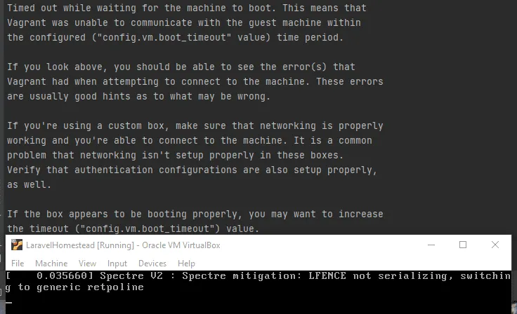 the configured (“config.vm.boot_timeout” value) time period.If you look above, you should be able to see the error(s) that